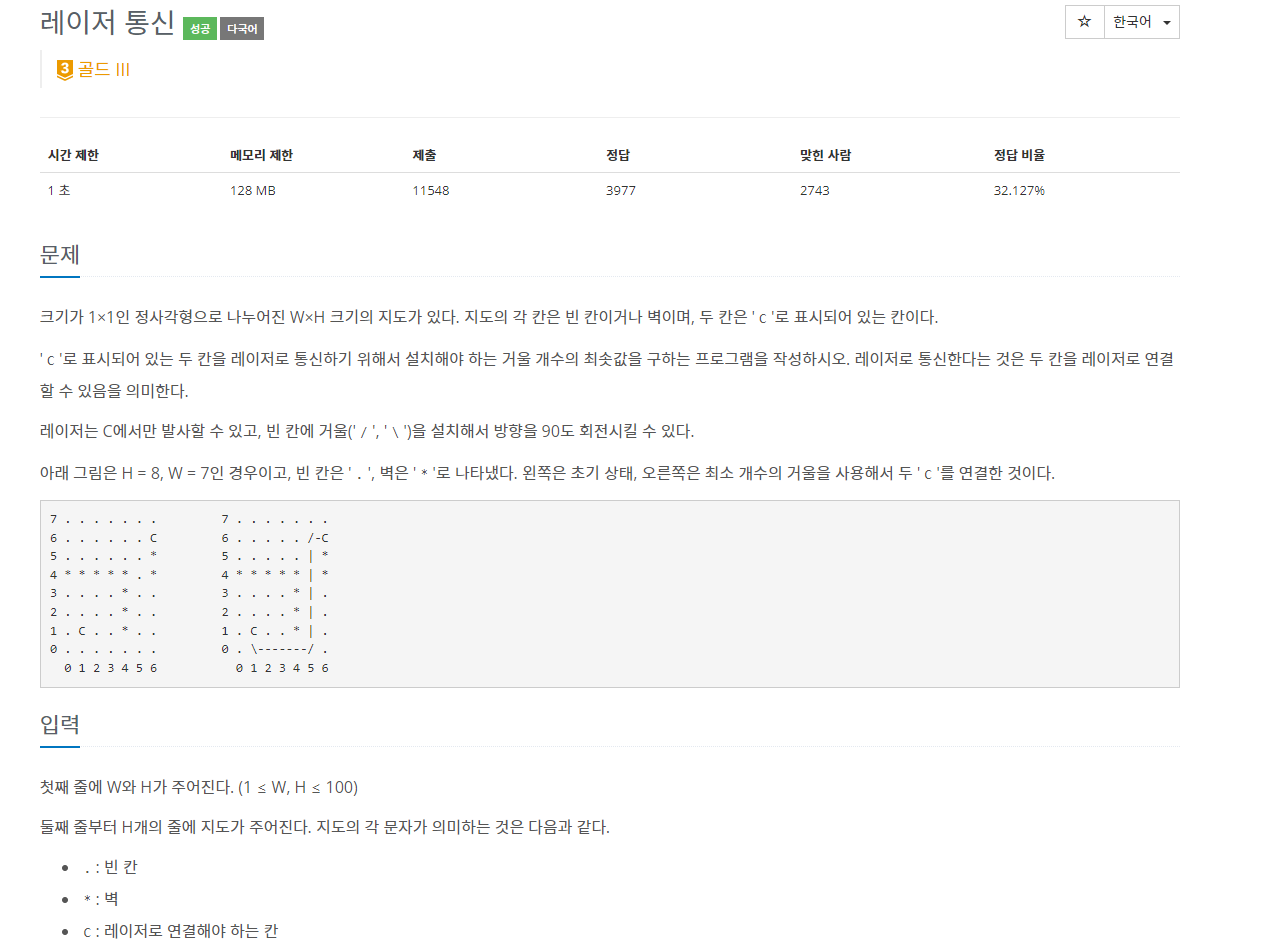 크기가 1×1인 정사각형으로 나누어진 W×H 크기의 지도가 있다. 지도의 각 칸은 빈 칸이거나 벽이며, 두 칸은 'C'로 표시되어 있는 칸이다. 'C'로 표시되어 있는 두 칸을 레이저로 통신하기 위해서
