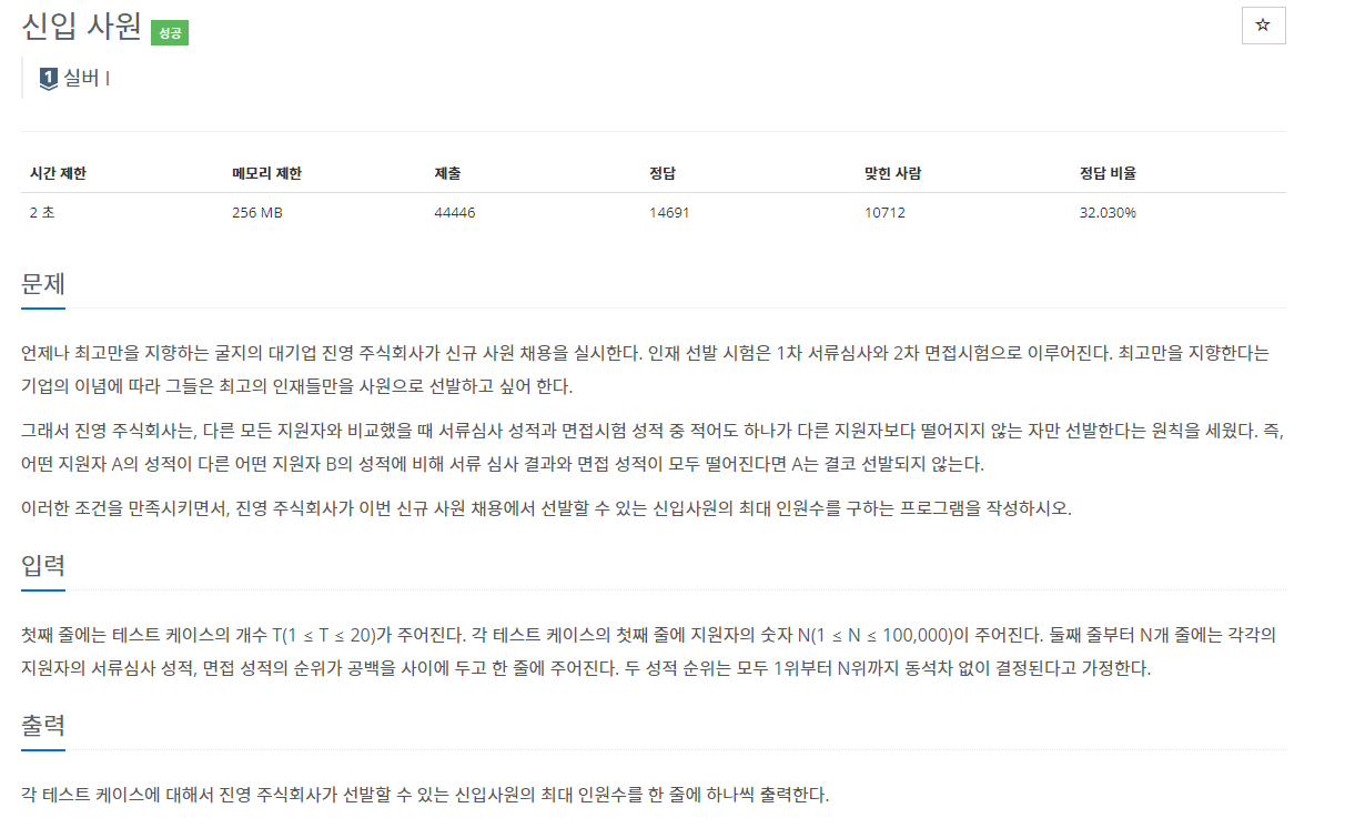 첫째 줄에는 테스트 케이스의 개수 T(1 ≤ T ≤ 20)가 주어진다. 각 테스트 케이스의 첫째 줄에 지원자의 숫자 N(1 ≤ N ≤ 100,000)이 주어진다. 둘째 줄부터 N개 줄에는 각각의 지원자의 서류심사 성